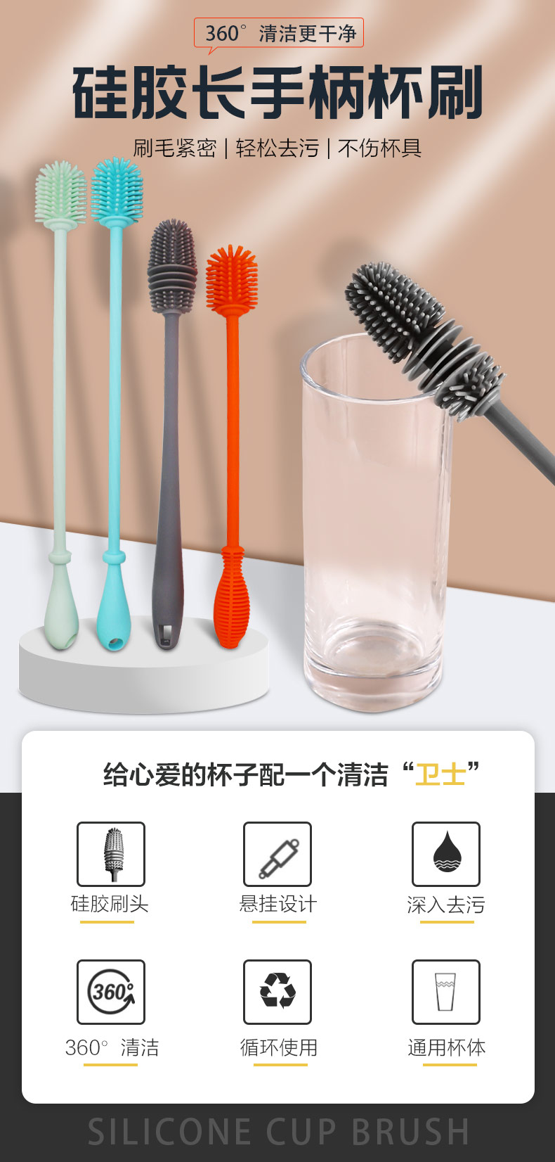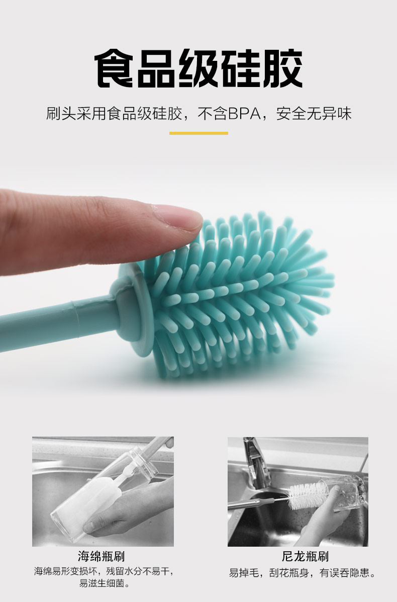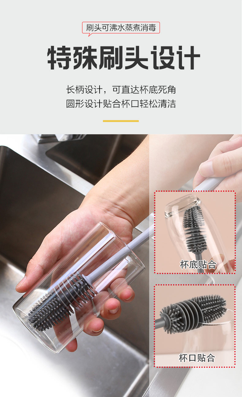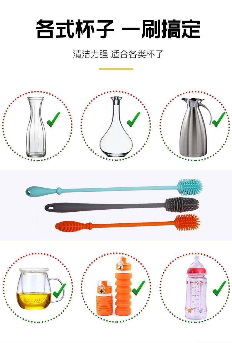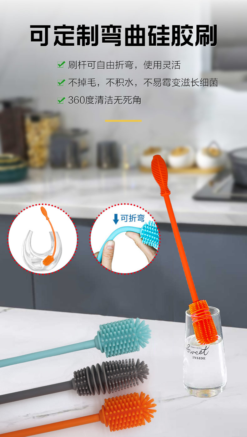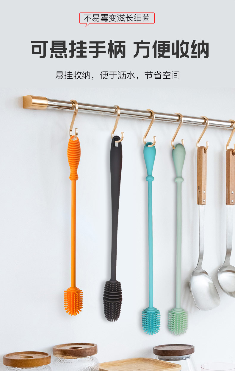 給心愛的杯子配一個硅膠刷,可以360度清潔水杯內(nèi)壁,刷頭采用食品級硅膠,不含BPA,無異味,相比海綿瓶刷不容易變形,不容易殘留水分滋生細菌。適合各類杯子的清潔??铺├鳛橐患夜枘z制品OEM廠家,有能力也有條件定制可彎頭的硅膠刷,人性化的設計,易懸掛便利瀝水,節(jié)約空間。
