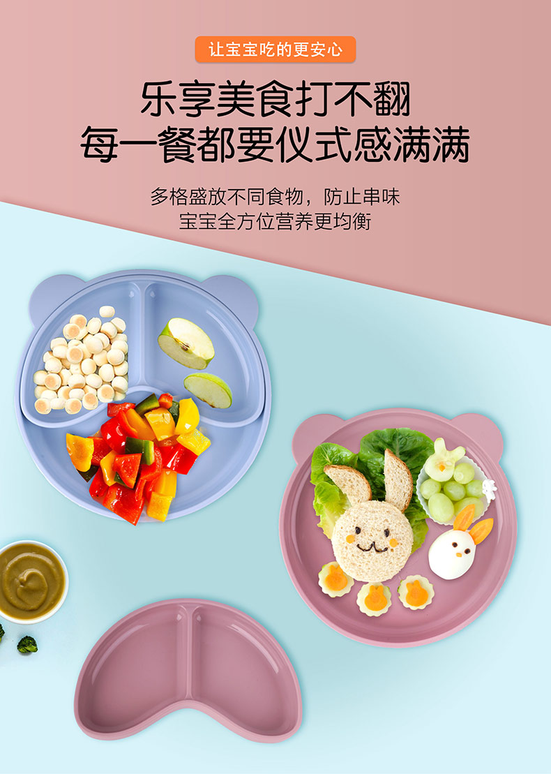 您的位置:首頁 > 產(chǎn)品中心 > 硅膠嬰童用品 > 硅膠碗 > 寶寶熱銷餐盤可拆分食品級硅膠分隔盤輔食吸盤三格兒童硅膠餐盤