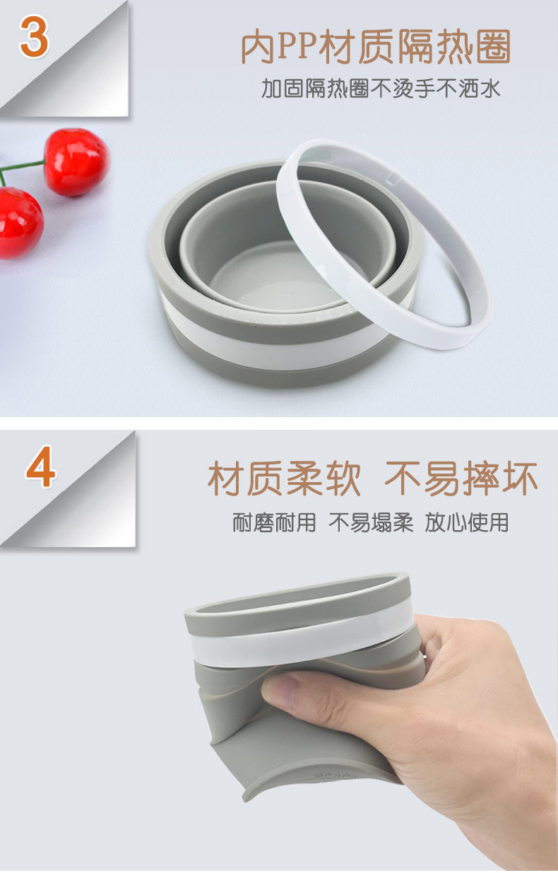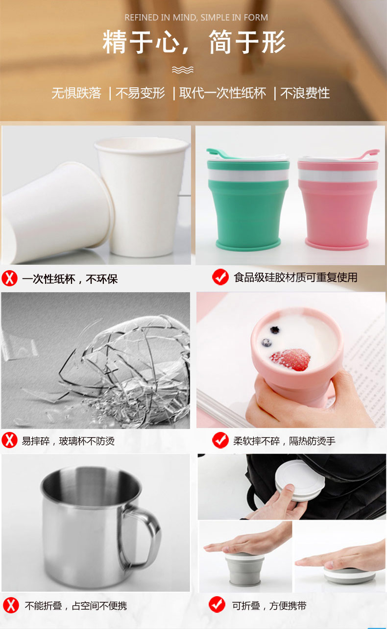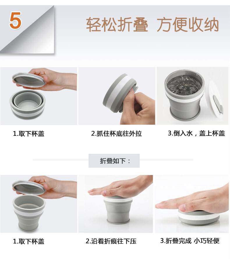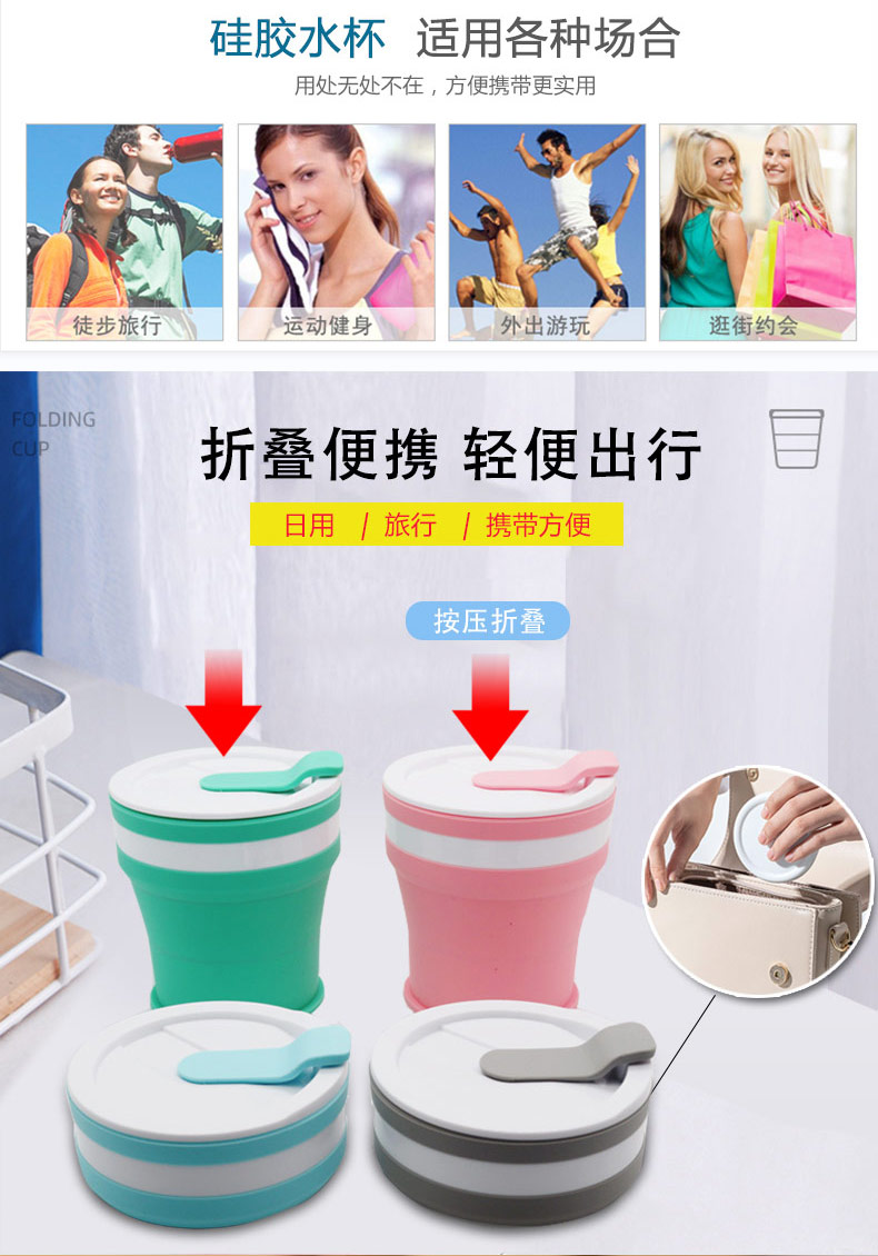 折疊式硅膠水杯成為運(yùn)動以及郊游的便攜物品之一,水喝完后直接折疊放入口袋減小儲物空間替代了對水壺和瓶裝礦泉水的不足, 完全顛覆了消費者對硅膠折疊水杯的看法,硅膠折疊杯是一種攜帶方便、使用衛(wèi)生、具有雙層杯壁的折疊杯。外壁的兩個相鄰段通過螺紋連接,內(nèi)壁的兩個相鄰段為錐形配合,可上下移動。通過外壁螺紋旋轉(zhuǎn)驅(qū)動內(nèi)壁上下展開,實現(xiàn)杯形折疊和拉伸動能。